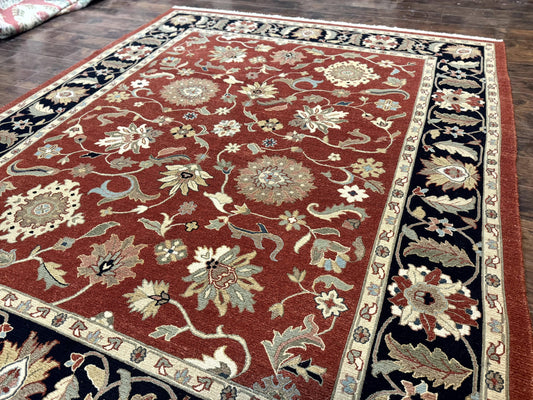 Indian Mahal Rug 8x10, Room Sized Wool Handmade Vintage Carpet, Red and Black, Floral, Flatweave Mahal Sultanabad Rug