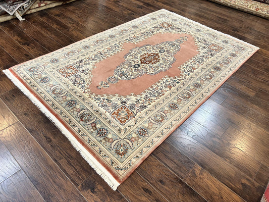Indo Persian Rug 6x9, Semi Open Field Medallion Rug, Vintage Hand Knotted Wool Oriental Carpet, Traditional Rug, Light Pink, Medium Size