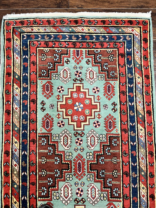 Persian Shiraz Rug 3x5, Geometric Tribal Rug, Wool Hand Knotted Vintage Carpet, Light Red & Blue, Signed by Masterweaver