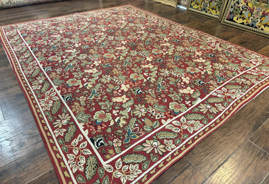 Indian Hand Stitched Rug 8x10, Large Vintage Floral Handmade Carpet, Dark Red Multicolor