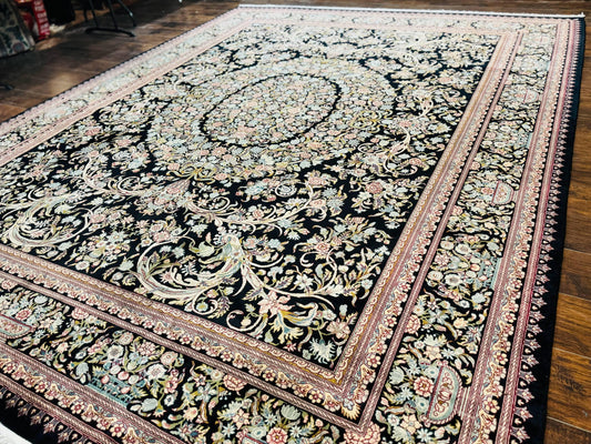 Pak Persian Rug 9x12, Highly Detailed Fine 260 KPSI, Floral, Handmade Traditional Carpet, Black