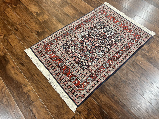Pak Persian Rug 3x4, Wool Hand Knotted Vintage Traditional Carpet, Navy Blue & Red, Very Fine Small Handmade Floral Rug